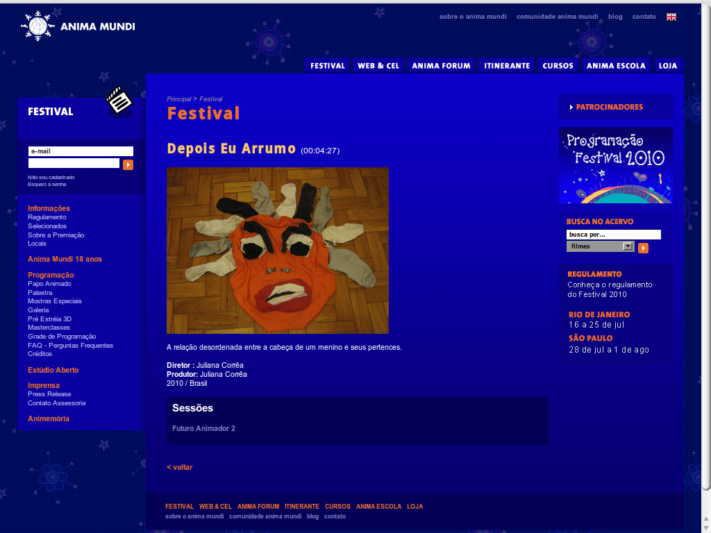 Minha cineasta preferida, a Juliana, estreia hoje sua carreira internacional. Seu curta de animação – Depois eu arrumo (com direção de arte da Mariana Flor) – que foi selecionado para a Mostra Futuro Animador no Festival Internacional Anima Mundi 2010, estreia hoje no CCBB – Centro Cultural Banco do Brasil do Rio de Janeiro. A sessão começa às 14:30h. Passe por lá e vamos assistir juntos. Eu convido pro cafezinho após a sessão.