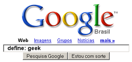 Por conta desse relacionamento tão antigo, e por ter aprendido tudo que sei (não é muito) sobre eles, sozinho, é que acho que eu poderia ser eventualmente classificado como geek ou nerd. Antes de mais nada, não chame um geek de nerd e vice-e-versa. Mas eu não ligo para rótulos. Para entender melhor a diferença, vá ao Google e escreva no espaço para busca o seguinte: define:geek e clique pesquisar. Depois repita o procedimento com define: nerd. Não conhecia? Gostou? Experimente outras palavras! ;-)